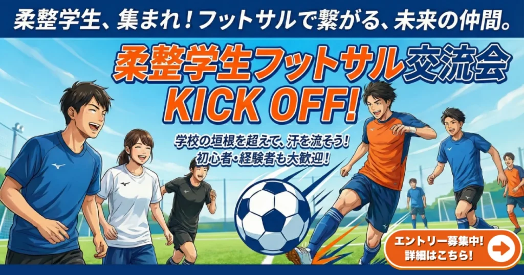 勉強のあとは、コートで走ろう!「フットサル好き」の柔整学生集まれ! 「国家試験が終わって思い切り体を動かしたい!」 「学年や学校を超えて、フットサル仲間を作りたい!」 「とにかく、楽しくボールを蹴りたい!」 そんな柔整学生のための、参加費完... -