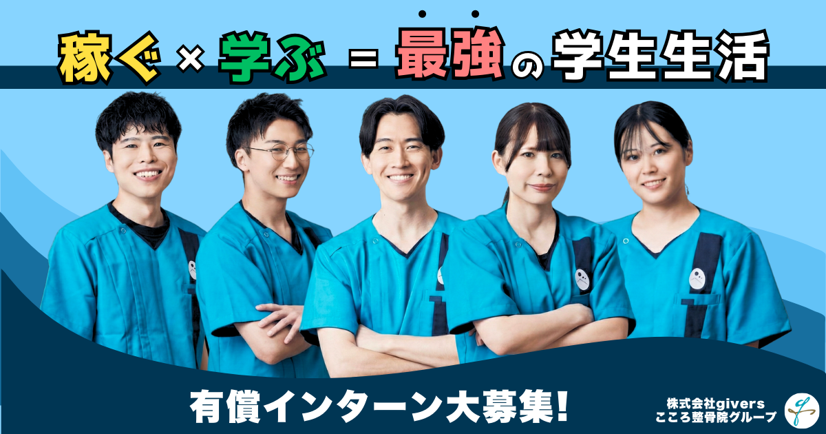 株式会社givers(こころ整骨院グループ)では、現在、柔道整復師・鍼灸師などを目指す有給インターン生を積極採用中です。