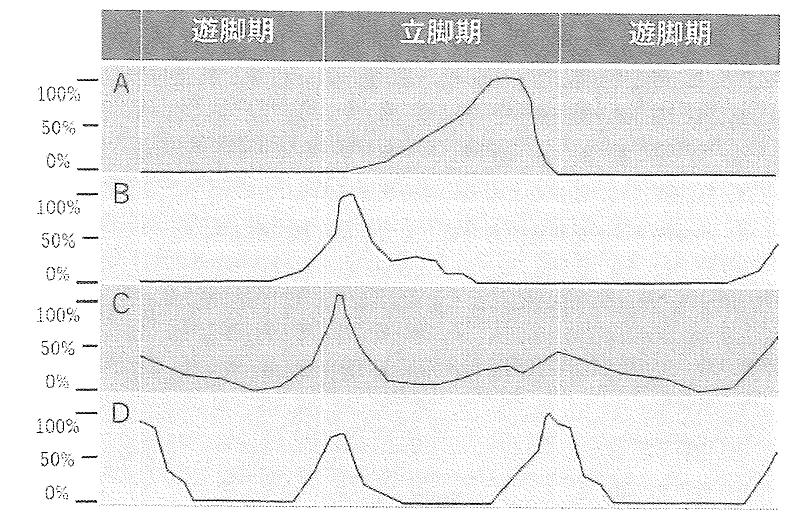 正常歩行時の筋活動を測定した図を示す。脛骨前筋はどれか。